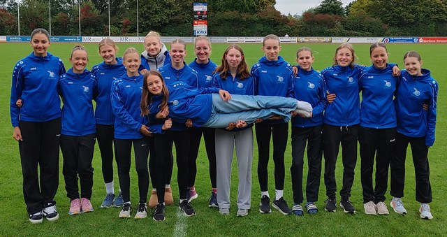 Mittlerweile kristallisierte sich heraus, dass die erste Mannschaft der LG Donau-Ries, die LG Aichach/Rehling und die DJK Memmingen den Titel unter sich ausmachen werden. Die Führung wechselte nur um wenige Punkte zwischen den Dreien hin und her. So galt es, im Weitsprung konzentriert zu bleiben und die Trainingsleistungen umzusetzen. Für die zweite Mannschaft sprang Kim Kleemann in persönlicher Bestleistung auf 4,20m und Johanna Schuster auf 3,99m. Anna Trescher mit 3,70m und Kristina Kreppold mit 3,69m konnten ihren Beitrag zur guten Teamleistung erbringen. Bei der ersten Mannschaft überzeugten gleich von Beginn an Viktoria Zajitschek mit erstmals übersprungenen 5,03m und Marie Weinberger mit 4,84m. Melina Brand und Alexandra Böck-Murr zeigten jeweils mit persönlicher Bestleistung was in ihnen steckt und komplettierten dieses herausragende Ergebnis. Beim abschließenden 100m Lauf kam es nun zum Showdown für die erste und zweite Mannschaft. Die Sprinterinnen Viktoria Zajitschek in 13,51s, Melina Brand in 14,14s und die angeschlagene Elena Erdle in 14,64s vertraten die erste Mannschaft. Johanna Brückner lief hervorragende 14,70s für die Zweite. Kim Kleemann (15,21s) und Luisa Miehling (16,19s) sprinteten zum ersten Mal die 100m und sammelten dabei wertvolle Punkte und Erfahrungen. Am Ende konnte sich die zweite Mannschaft über einen nicht zu erwartenden 5. Platz von 7 teilnehmenden Vereinen freuen und überzeugten durch eine großartige Stimmung. Für die erste Mannschaft war es noch sehr spannend, ob es doch für den Sieg reichen könnte, da die LG Aichach/ Rehling ihnen beim 100m Lauf noch einige Punkte abgenommen hatte. Zehn Minuten nach der letzten Disziplin war dann die Freude groß, als diese großartige Teamleistung mit der schwäbischen Meisterschaft belohnt wurde.